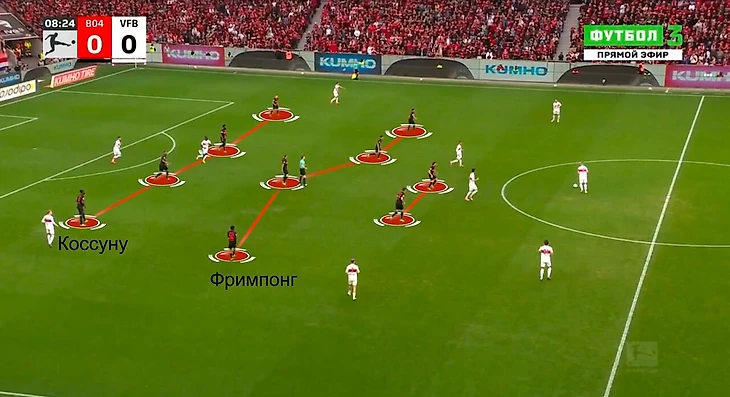 Сначала хорошее. «Байеру» было проще реагировать на розыгрыши «Штутгарта» от ворот («Штутгарт» разыгрывает четверкой, так что «Байеру» в 4-4-2 удобнее ориентироваться по игрокам). И гораздо лучше перекрываются фланги, через которые «Штутгарт» здорово продвигал мяч в первых двух матчах сезона против «Байера». Особенный потенциал был на левом фланге, где Крис Фюрих и Макси Миттельштадт встречались с Фримпонгом. Поддержка Коссуну явно уместна.
