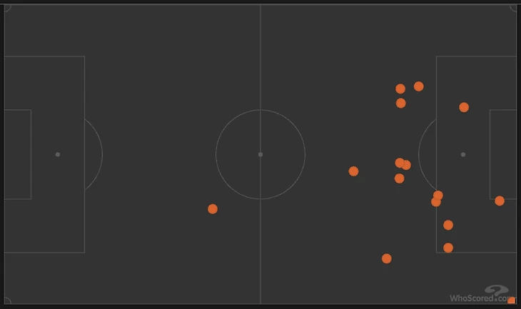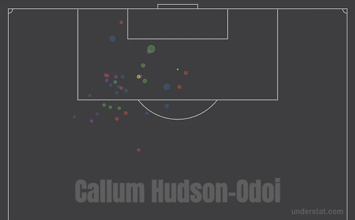 Сам Каллум после прихода Нуну принялся копировать манеру Арьена Роббена. С одним отличием: если Роббен смещался в середину под удар с левой, то Хадсон-Одои перекладывает под правую. У Каллума даже появился свой собственный офис, откуда пытается чаще всего. Как правило, это левый угол штрафной. На карте помечены все попытки, зеленым – голы: