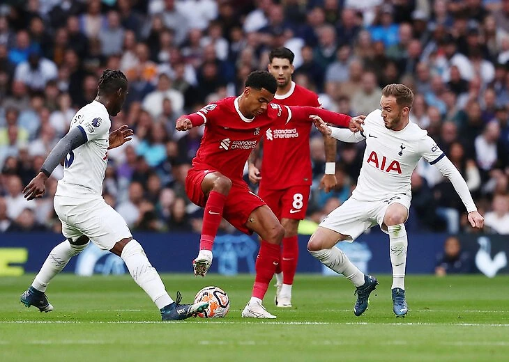 Не всегда «Ливерпуль» обострял в позиционных атаках (еще здорово помогал прессинг), но «Тоттенхэм» правда плохо сдерживал числом. Из-за того, что совсем не играли в таком сочетании, тройка опорников плохо делила обязанности – не понимали, кто должен выдвигаться, а кто страховать. Усугубил выход у «Ливерпуля» сразу двух креативных восьмерок – был не только Мак Аллистер, но и Харви Эллиотт.
