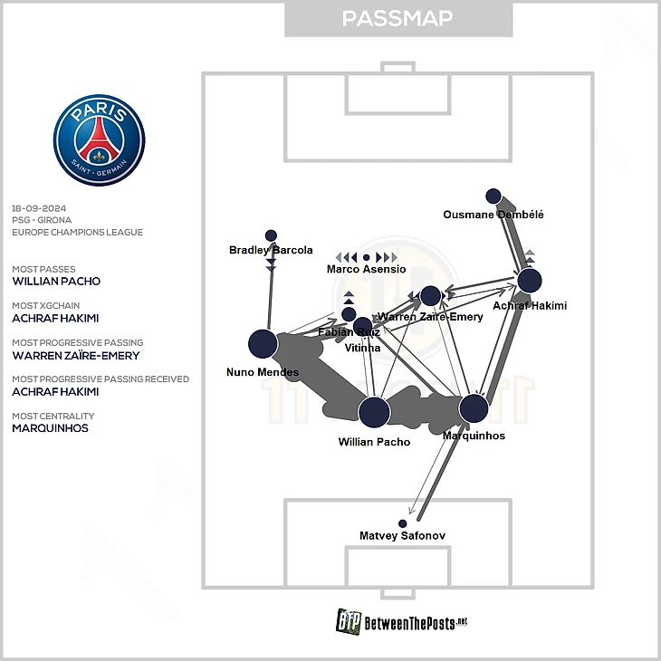 Около 60 минут «Жирона» достойно сдерживала «Париж». В схеме 4-4-2 держали средний блок, ситуативно шли в давление, выдавали собственные отрезки владения. На этом этапе сформировалась вот такая карта передач «ПСЖ»: