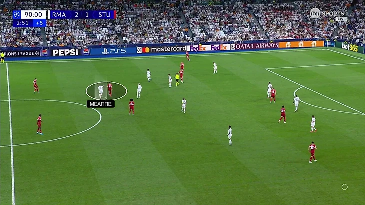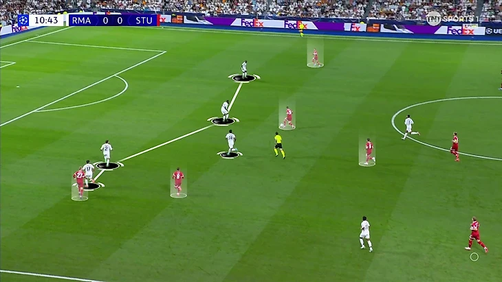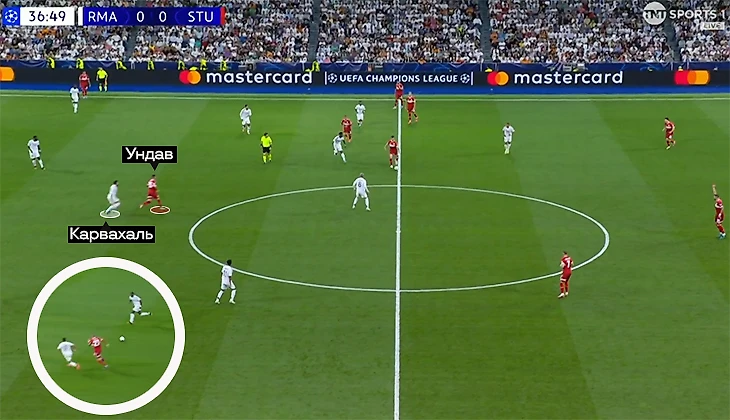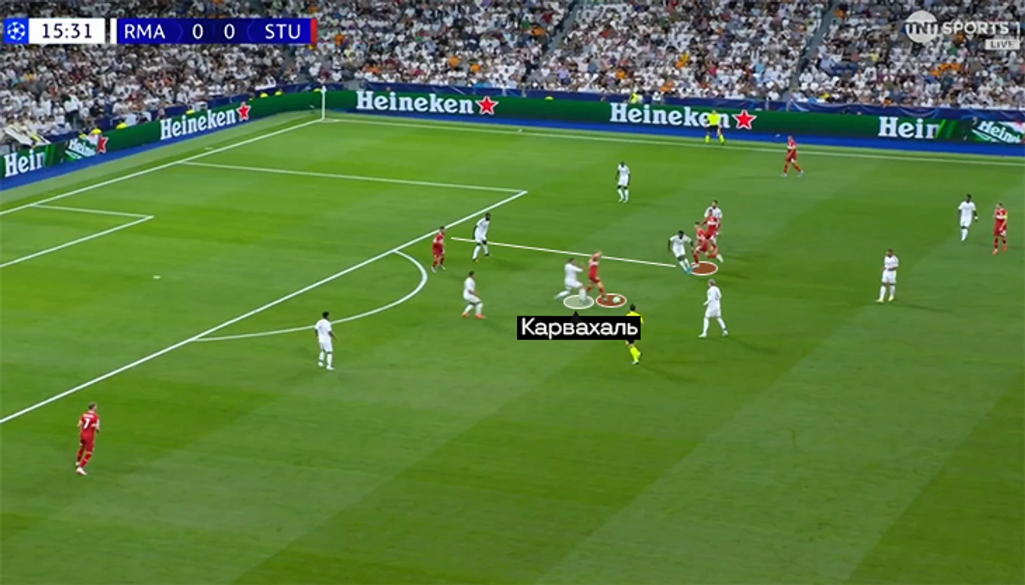 Команда весьма быстро садится в схему 4-4-2 или даже 4-5-1, если успевает опуститься Винисиус. Весьма быстро, но недостаточно быстро относительно игры «Штутгарта» в пас. Немцы регулярно ловили «Реал» на скорости оборонительного перехода. Вот такие ситуации возникали даже не в контратаках, а после розыгрышей «Штутгарта»: