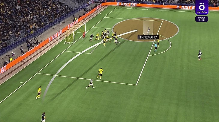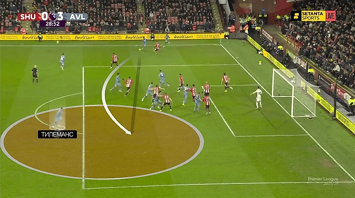 Одна из любимых фишек Юри – открывания на границе штрафной во время угловых. Тренеры по стандартам любят расчищать под него пространство и выводить на удар. Чего не хватало все последние годы, так это удачи и реализации. Вот два однотипных эпизода: сначала за «Лестер» (осень-2022), потом за «Астон Виллу» (зима-2024). Оба раза Тилеманс попадал в перекладину: