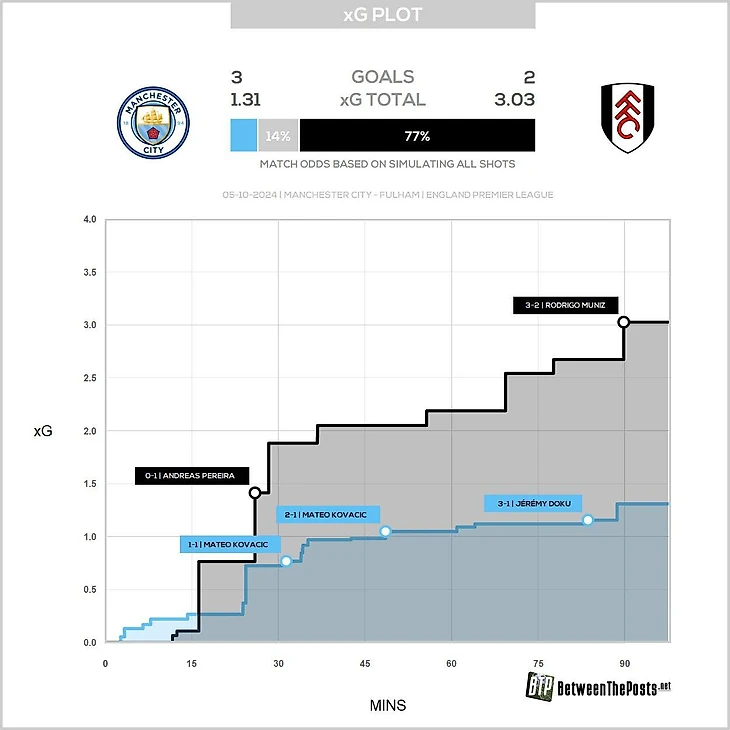 Главная несправедливость выходных – победа «Ман Сити» над «Фулхэмом» (3:2). Абсолютно все модели xG в пользу гостей, все дают им ощутимый перевес. Некоторые вообще оценили моменты «Фулхэма» в три ожидаемых гола. Фантастика по всем параметрам.