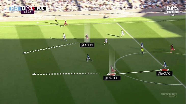 Во-вторых, Адама Траоре на левом фланге, хотя обычно стартует справа. Ход – специально под Рико Льюиса. Учитывал не только скорость Траоре, но и высокую позицию, которую Льюис занимает в позиционных атаках. Это дополнительно помогало Адама разрывать.