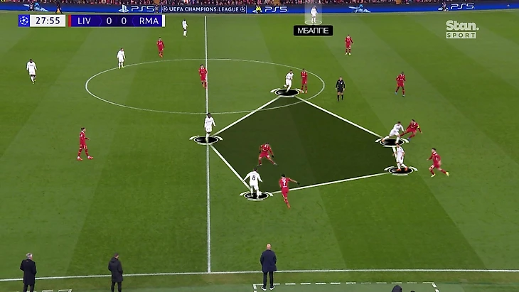 Вторая – более тактическая. Мбаппе при обороне играл в паре форвардов 4-4-2, а при владении четко занимал левый фланг – как он любит. Только в комплекте с этим удобным набором «Мадрид» почему-то сделал главным флангом для построения комбинаций – правый. Против «Ливерпуля» больше атак развивалось именно через эту бровку, что нетипично для «Реала» по сезону (они обычно самая перекошенная налево испанская команда). Численный перегруз тоже формировался именно справа:
