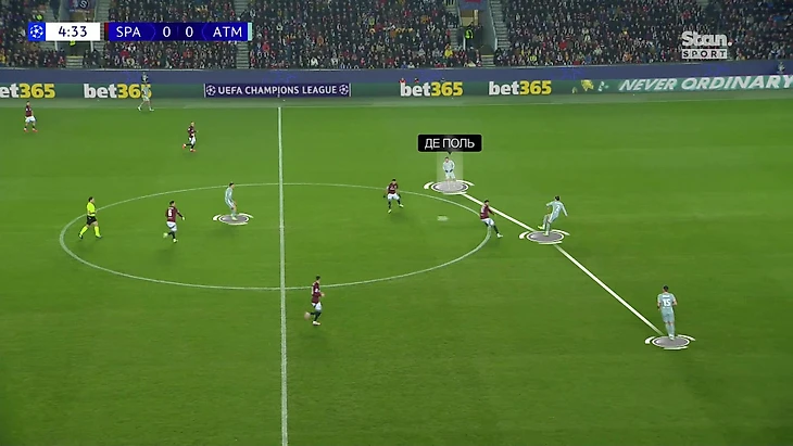 Это более смелое соотношение, чем классика большинства команд 3+2. Иногда – под акцентированным давлением – для помощи спускался Родриго Де Поль (3+1):