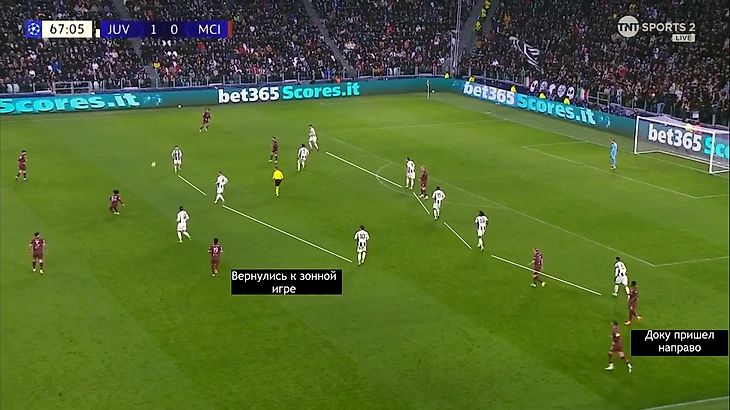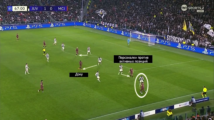 Активные персоналки включались в ответ на пас назад или поперечный на фланг. Если «Ман Сити» застревал и начинал обмен позициями, «Юве» возвращался к зонной игре, отслеживал перестановки и начинал заново.