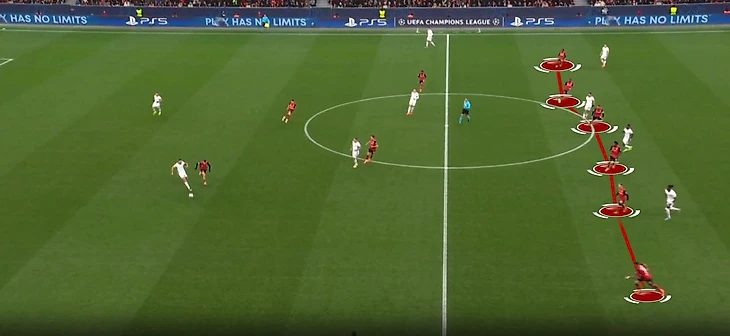 Олицетворение замысла – третий гол. Винисиус ассистировал из опорной зоны, куда вытащил центрдефа Исака Хина. Также обратите внимание на расположение другого ЦЗ Сеада Колашинаца – он играет по Браиму Диасу и тоже далек от номинальной позиции: