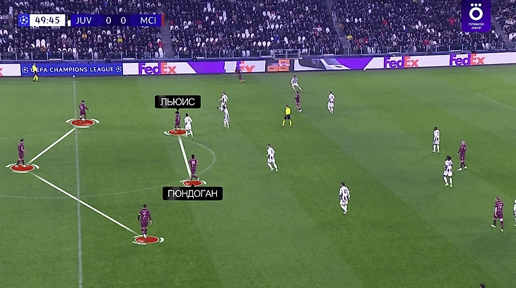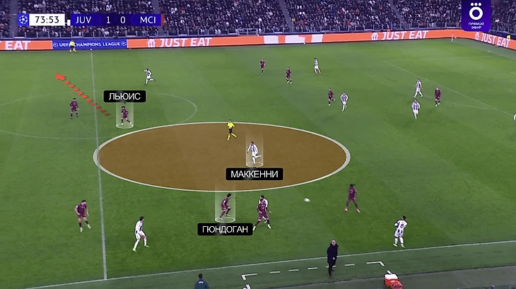 Пожалуй, главная беда: часть команды нацелена на предотвращение контратаки, а другая – на сдерживание. Гюндоган – в первой группе (пытается отобрать сразу после потери). Льюис – во второй (не верит в партнеров и возвращается на позицию). Жертва – опорная, которая превращается в проходной двор. Показательно, что в обоих голах ее оголяли непрофильные игроки «Юве». В первом случае – центральный защитник Гатти, во втором – опорник Маккенни.