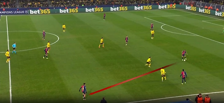 Педри великолепно искал мяч даже с опекой. Например, запросто уходил ближе к флангу, успешно прячась от центральных полузащитников «Дортмунда». Пас – и Педри выводит «Барсу» из защиты.