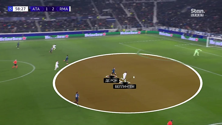 Беллингем сделал фирменный рывок и состязался с Мартеном Де Роном, который отстал на старте и по ситуации вынужден прикрывать зону левого центрального защитника: