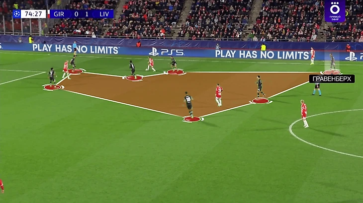 Против «Жироны» был превентивный маневр – команда начала зажимать соперника на его половине. Одна из фишек – смещения в уязвимую зону Райана Гравенберха. Создавал дополнительную плотность в прессинге и не позволял разбежаться сильному флангу «Жироны»:
