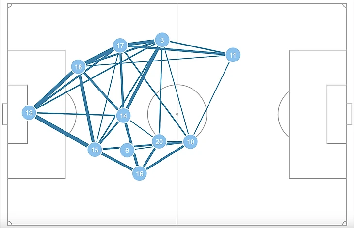 Формула, по которой команды создают моменты: химия между игроками фланга + смещения нападающего, который дополнительно нагружает зону. У «Ньюкасла» эту роль исполнял Александр Исак, у «Жироны» – Арно Данджума. Замысел хорошо виден на карте передач испанской команды. На фланге не только связка Блинд (17) + Гутьеррес (3), но и Данджума (11):
