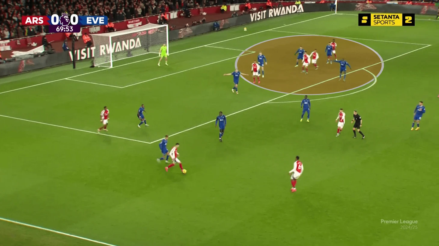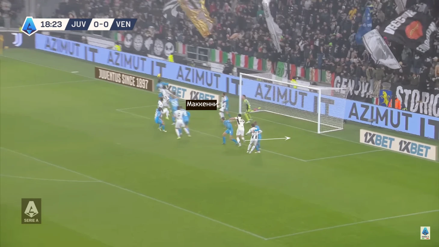 Тюрам занимает фиксированную позицию. Маккенни делает рывок перед подачей и занимает вратарскую: во-первых, исключает вероятность офсайда, во-вторых, блокирует защитника.