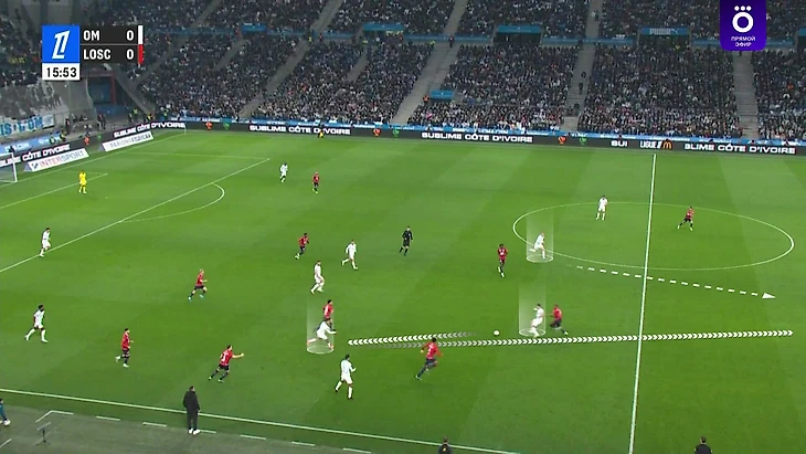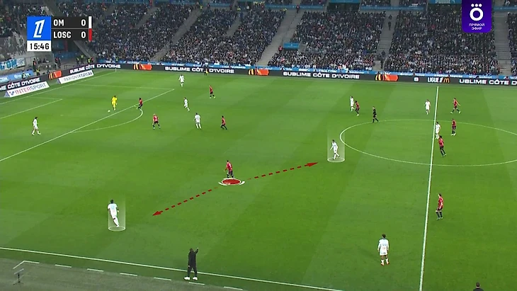 Направляют атаку во фланг, где игроку «Лилля» придется разрываться: