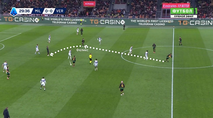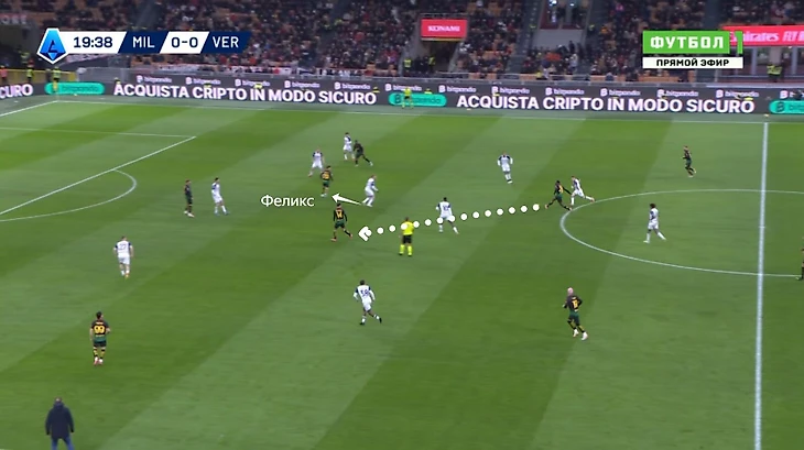 Во-первых, Феликс сам находил пространство. Вот Малик Тиав заметил его открывание в центре, когда опорник «Вероны» Ондрей Дуда отвлекся на Тейани Рейндерса. Так новичок «Милана» вторым касанием довел мяч до Сантьяго Хименеса в зону перед штрафной.