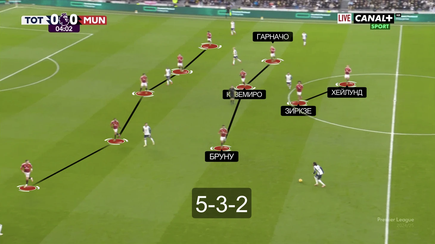 Главный плюс – «МЮ» неплохо пользовался наличием пары Зиркзе-Хейлунд впереди. Нападающие либо вскрывали отсутствие подстраховки у центральных защитников «шпор» (ситуации 2-в-2), либо уводили пару ЦЗ таким образом, чтобы пространство получал кто-то из партнеров (как правило, Гарначо). Создали достаточно моментов для гола, но подвела реализация – по мнению Аморима, единственная разница между командами.