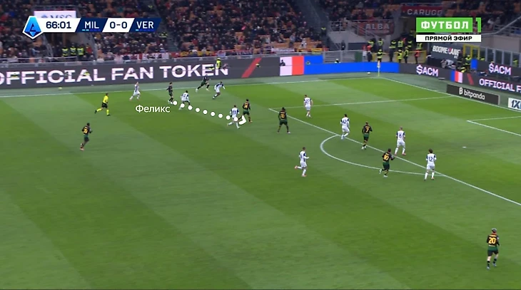 Феликс против «Вероны» (1:0) двигался разнообразно и появлялся практически везде. Он не только бродил между линиями, но и смещался на фланги, приходил к опорникам в начале атаки или открывался за спину.