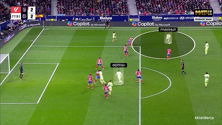 Второй значимый фактор – изменения Ханси Флика. Для игровой динамики важнее всего был выход Феррана Торреса и смена позиции Рафиньи, который ушел с левого фланга в центр. В лице Феррана «Барса» получила второго форварда. В лице Рафиньи – свободного игрока, который перегружает зоны.