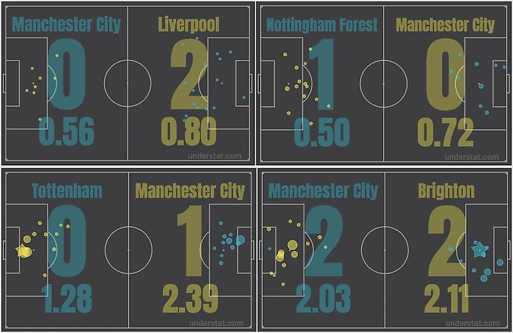 В матчах с «Ливерпулем» и «Ноттингем Форест» был создан всего 1 явный момент. В матчах с «Тоттенхэмом» и «Брайтоном» – 15. Главная проблема до сих пор не решена – «Сити» по-прежнему не доминирует над соперниками. Но от чего зависит характер игр, который так радикально меняется от тура к туру?