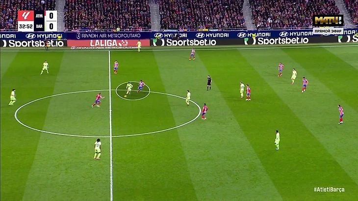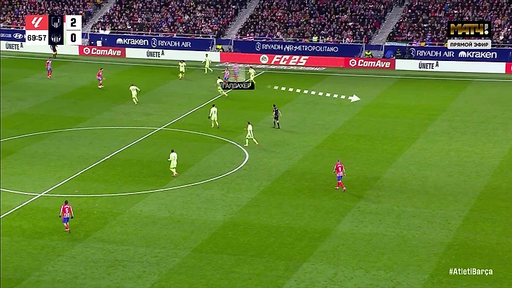 Во-вторых, особое внимание уделялось Педри. В него вцепился Родриго Де Поль. Аргентинец часто действовал вне схемы, оглядываясь только на Педри. Иногда это вело к более высокой позиции, иногда – к более глубокой: