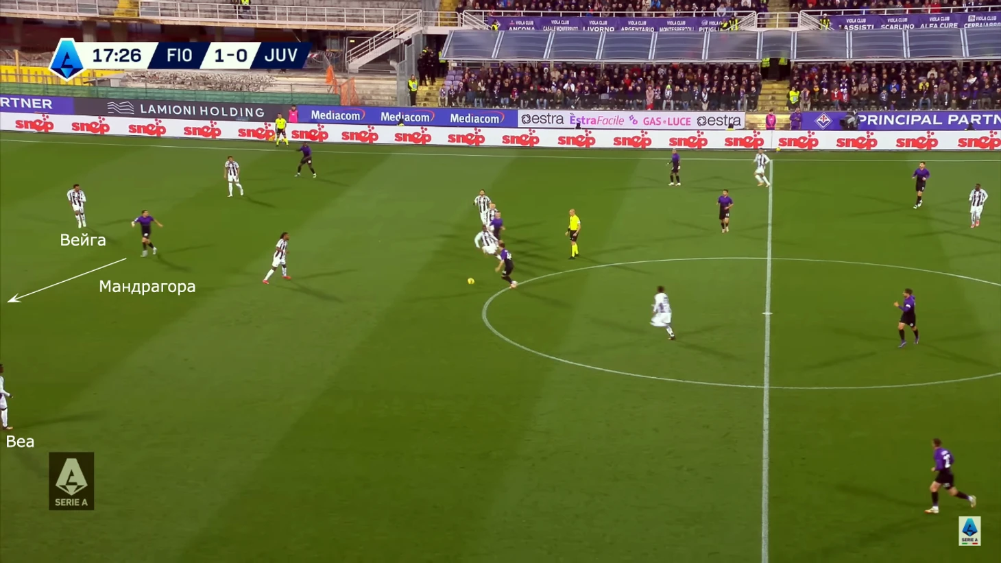 Но его позиция обезличена, не учитывает соперника. Мандрагора не дриблер и тем более не спринтер. Зато с его левой можно ходить на охоту. Против него нужно играть плотнее, чтобы не дать пробить, и риск будет минимизирован – отдать некому, зацепиться сложно, пробрасывать не вариант. Вейга, оставив фору по учебнику, подарил ее флорентийцу – окажись на метр ближе, успел бы заблокировать удар.