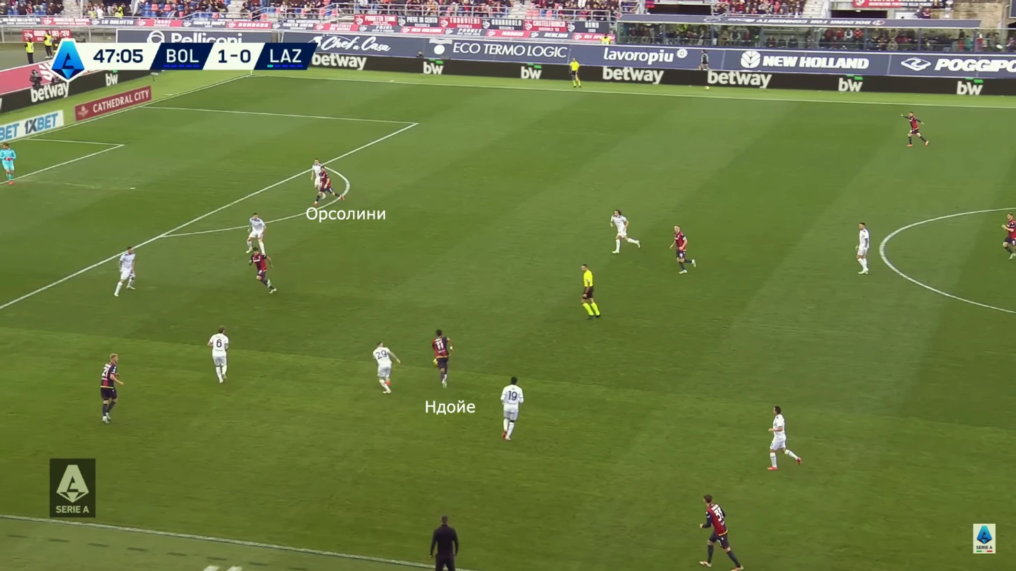Старт атаки – типичное смещение Ндойе с края в центр. Орсолини начинает классическое диагональное движение за спину центральному защитнику, но шансов у него мало. По нему играет левый защитник Марушич. Римлянин в правильной позиции – одновременно видит и мяч, и своего оппонента. Потенциальный забег под контролем.