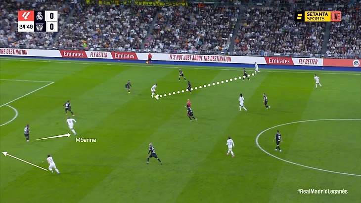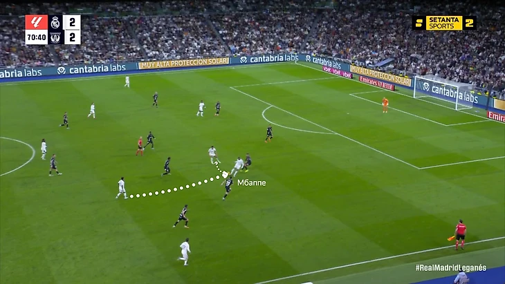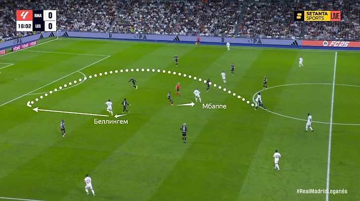Эдуардо Камавинга в опорной зоне был закрыт для прямой передачи, но Мбаппе выручил Антонио Рюдигера. Килиан опустился ниже и в касание доставил мяч Камавинга. Одновременно с этим форвард выдернул из линии защитника и освободил зону для рывка Джуда Беллингема (пришлось реагировать опорнику Ренато Тапии).