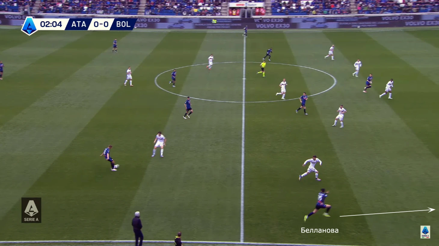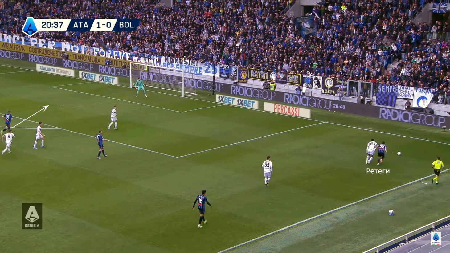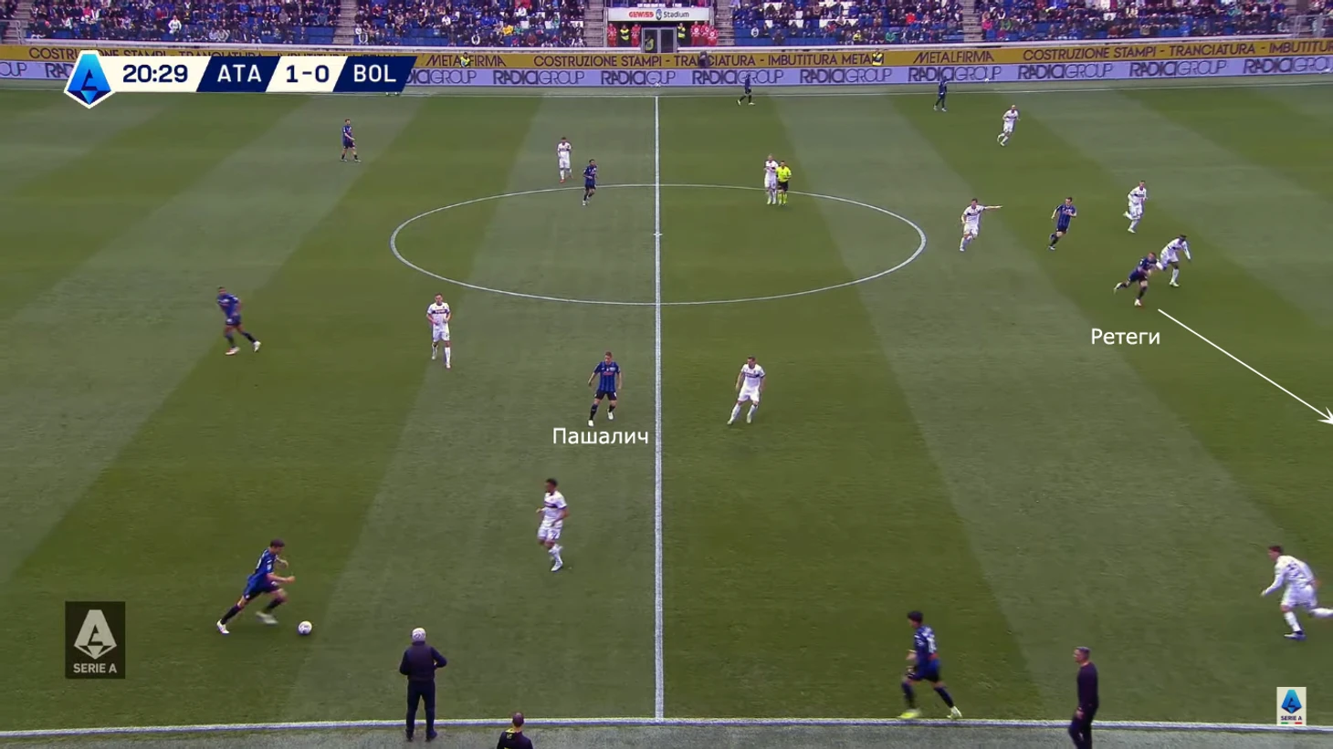 Обратите внимание на позицию Пашалича – именно он замкнет атаку. Бергамаски использовали сложности с передачей игроков: центральный защитник Лукуми ушел за Ретеги, но проиграл уже выигранную борьбу (отвлекся, жалуясь судье, и Матео воспользовался этим), а второй ЦЗ не заметил подключение, начавшееся в центре поля.