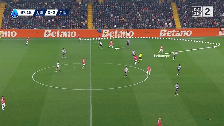 Еще один яркий момент возник после того, как Лука Йович отвлек на себя Томаса Кристенсена. Тейани заметил это и ускорился в свободную зону. Опорник «Удинезе» Йеспер Карлстрем передал его Бийолу, но Рейндерс обыграл защитника и ударил после входа в штрафную на ведении.