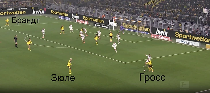 Обычно дальнюю замыкает Даниэль Свенссон, левый латераль «Дортмунда». К этому соперник привык, его держали. Однако «Гладбах» потерял Юлиана Брандта, левого инсайда. Фактически Брандт и Свенссон поменялись местами, и Брандт забежал на дальнюю из слепой зоны для защитников, из широкой позиции на левом фланге. И отлично пробил по летящему мячу.