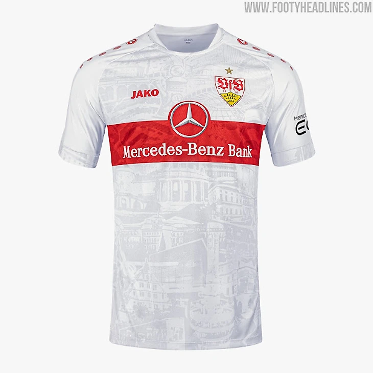 В Германии этом году своих болельщиков порадовал «Штутгарт». Команда представила два крутых комплекта формы. Домашние футболки имеют классическую структуру с красной полосой по центру на белой основе, но отличает их изящно нанесенный силуэт городских достопримечательностей города. Здесь и стадион клуба, и штутгартский Новый дворец, и колесо обозрения в развлекательном районе Вазен.