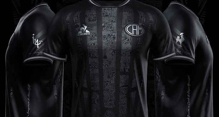 В Южной Америке тоже достаточно интересных комплектов. «Атлетико Минейро» разработал лаконичный и стильный дизайн для третьей формы. На черных футболках видоизменена эмблема клуба, а сами футболки украшает принт в виде полос, на которых запечатлены все знаковые события в истории команды, от великих личностей до выигранных трофеев. На рукавах изображение цифры 114, обозначающей возраст клуба.