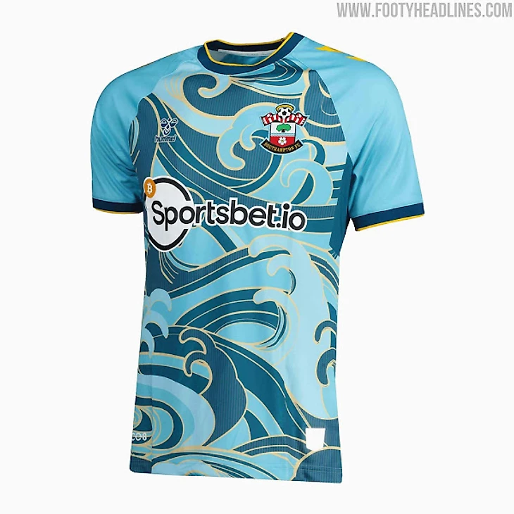 Не сговариваясь, схожий дизайн презентовал и другой прибрежный клуб. «Саутгемптон» изобразил на бирюзовой форме аквамариновые волны с золотым окаймлением. Как сказано в официальном релизе, морское оформление символизирует близость города к Соленту. Это пролив, отделяющий Великобританию от острова Уайт.