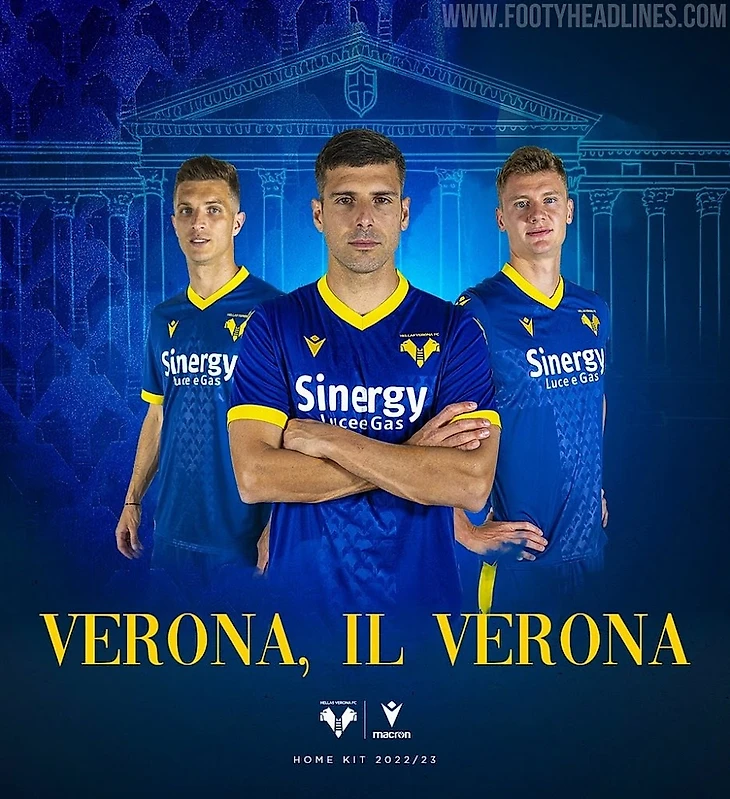 На очереди Италия. «Верона» представила не броские, но очень элегантные домашние джерси. Классический синий цвет, с желтыми манжетами и воротником. Посредине из множества эмблем клуба составлен крест, являющийся гербом города еще с XIII века.