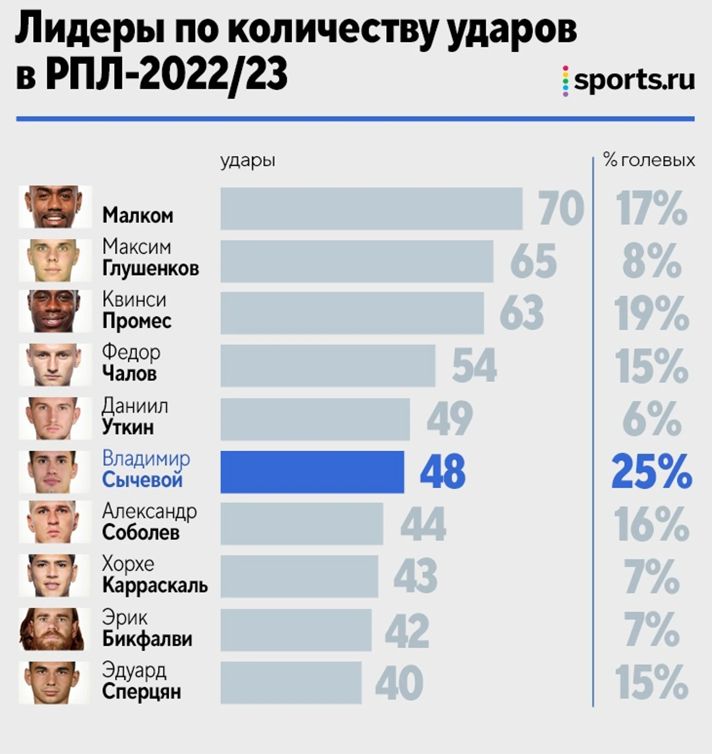 Трудно обойтись без сравнения Сычевого с Гамидом Агаларовым-2021/22. В прошлом сезоне Агаларов долго с отрывом лидировал по проценту ударов, которые превращались в голы (показывал аномальную реализацию), а завершил год вторым после Матео Кассьерры (21% против 23%). В этом чемпионате Сычевой показывает еще более высокий результат.