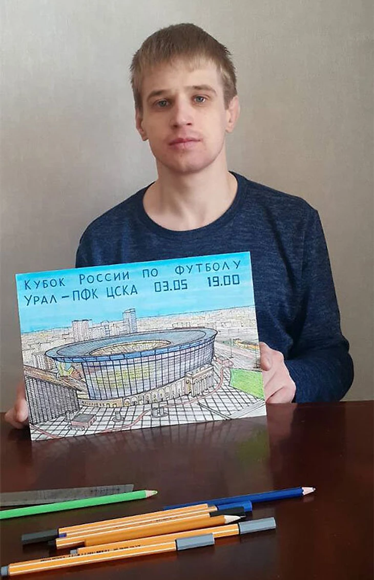 В апреле ЦСКА провел очень добрую акцию – предложил поработать особенному урбанистическому художнику Алексею Горюнову. Его диагноз – аутизм, а еще он с детства не слышит. Но это не мешает 29-летнему Алексею жить полноценной жизнью: он окончил школу, учится в колледже, любит путешествовать по стране и изучать архитектуру городов. А еще обожает рисовать (особенно – дома и станции метро). В среднем на картину он тратит четыре часа: по два часа на набросок и работу в цвете.