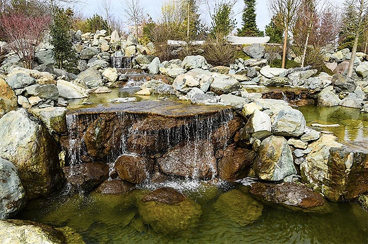 Тройной водопад в Японском саду начинается на высоте 7 метров и разделяется на три потока (каждый – с разной скоростью течения). Потоки превращаются в водопады, а затем сливаются воедино. Объемно-пространственная композиция Тройного водопада выполнена в виде ступенчатых перепадов.