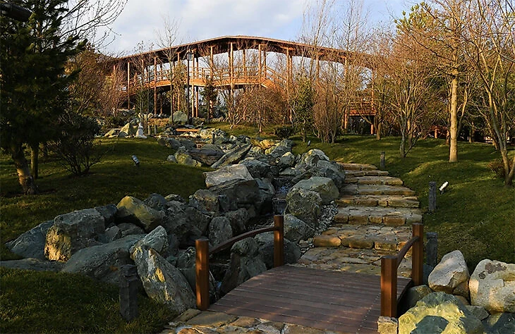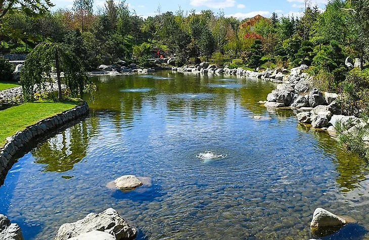 Озеро с живописными водными потоками, соединяющими верхний и нижний уровни водоема. В нижней части обитают японские карпы кои, в верхней – красноухие черепахи.