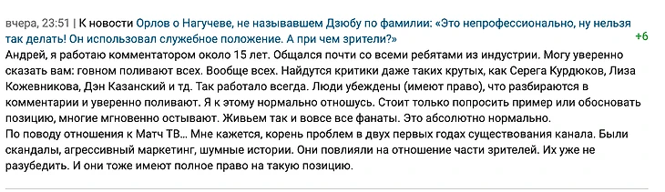 Дима приходит в комменты спортса и вопрошает у читателей(к слову это похвально смело), что же они его так не любят и почти всегда жалуется, что хейт субъективный, а конкретные примеры никто не приводит. Иногда есть кто-то, готовый зацепиться с Димой языком и привести пару примеров, где Дима сделал что-то не так: затянул с какой-то аналитикой, пол репортажа неуместно шутил и все такое, но в основном люди спамят про интершум и выключение громкости телевизора. Впрочем я согласен, что звук выключает пол процента совсем двинутых людей, а остальные давятся, но терпят. Расскажу Диме тайну - ни один зритель и не должен дефрагментировать репортаж, разбирая 90 +17 минут до состояния винтиков, это вообще не дело смотрящего футбол. Комментарий спорта - это такой формат массового искусства, который воспринимается цельно. Ты либо ставишь лайк, либо свайпаешь дальше. Никто не скажет первые пятнадцать минут Шнякин был чертовски хорош, потом десять минут было лажи, а потом страшная бомба-аналитика подъехала в конце тайма. Это дело Сергея Акулинина или кто там у вас отвечает за менеджмент комментаторов и продюссирование. Никто не смотрит и не слушает ютуб шоу или подкасты с неприятным ведущим, но в спорте продукт прикован к комментатору и остается единым целым. Первичная задача комментатора поверхностна: поймать и зафиксировать внимание человека на n-времени, а если там есть глубинные смыслы и дополнительная ценность, то это по настоящему талантливая работа. «Правильно» комментировать невозможно, просто надо не нарушать базовые правила, вроде уважения к обеим командам или создание у зрителей звукового восприятия происходящего. Современный комментатор не существует в отрыве от своего медийного образа начиная с азартного, вспыльчивого и эмоционального Генича и заканчивая какими-то домашними комментаторами, вроде метафоричного Аболина. Отношение к профессиональной стезе невозможно разделить от того, что вы(таланты Матч.ТВ) пишите, говорите и делаете. Это теперь тоже - часть вашей профессии, а вы считаете, что - нет. Почему лично мне не нравится Дима и современное комментирование РПЛ Дима «не мой» комментатор потому что в меня не попадает его юмор, я плохо понимаю желание поддеть футболистов в эфире, мне не нравятся эти «ретро-некро параллели» а-ля условный Тюкавин забил как условный Мальдини в 87 году и больше всего меня раздражает в Диме Шнякине эта черта большинства комментаторов Матч.тв - уверенность в своем понимании футбола. Количество матчей «закинутых» на 70-ой минуте после 2:0 или что-то такое просто бесчисленно. Вы кажется все забыли(для меня в этом вопросе наверное Генич единственное исключение) зачем болельщики проигрывающей команды смотрят остаток матча. В каждом живет надежда на камбэк, шанс на чудо или доехавшую ставку. Умение продолжать подогревать веру и интерес действительно исключительное, но это необходимый скилл комментатора, который почему-то канул в лету. Очевидная истина, что величайшие репортажи в истории футбола - там где команда совершила камбэк, а комментатор оставлял шансы и давал аналитику на такой исход до начала камбэка. Но гораздо менее очевидная, но не менее важная истина, что смотреть футбол с ощущением безнадежности происходящего это какое-то бессмысленное развлечение с неприятным послевкусием, которое появляетс