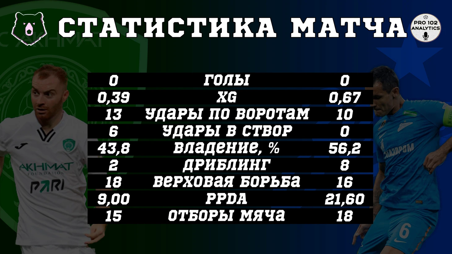 Всем привет! Футбол, безусловно, самая непредсказуемая игра на Земле. От матча между грозненским Ахматом и питерским Зенитом мы ожидали обилия атак и, возможно, забитых мячей, а получили первый безголевой матч в новом сезоне! Эта встреча выявила значительные трудности в организации игры у обеих команд как в равных составах, так и при игре Зенита в меньшинстве.