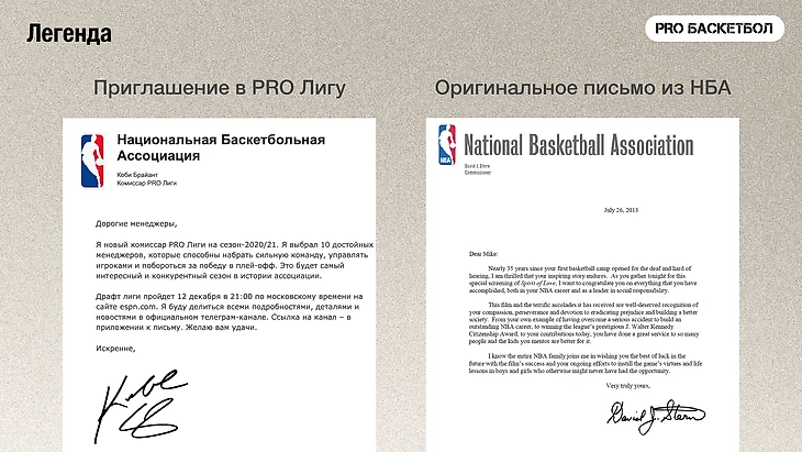 1. Придумать легенду. Когда я запустил PRO Лигу, я приглашал участников с помощью письма от НБА. Письмо содержит дату и время драфта, основные моменты по организации, имя и подпись комиссара. По легенде Адам Сильвер назначил Коби Брайанта нашим небесным комиссаром. Но легенда ничто без живого подкрепления.