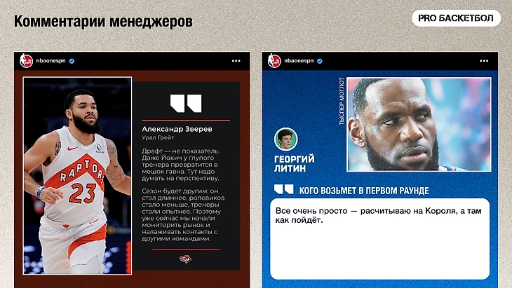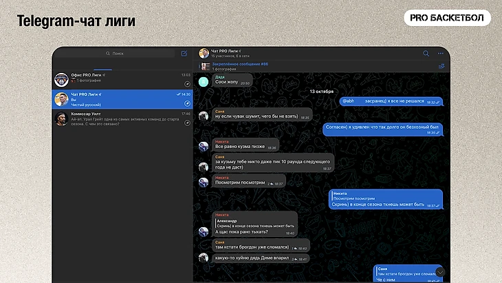 Комиссар пишет участникам лиги в Telegram и спрашивает их про тактику, обмены, травмы игроков, результаты матчей и ожидания от драфта. Он превращает все это в истории и публикует в закрытый Telegram-канал «Офис PRO Лиги». И оформляет все это, как карточки из аккаунта NBA on ESPN в Instagram.