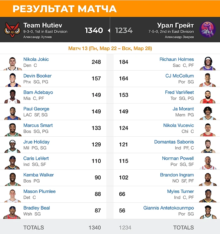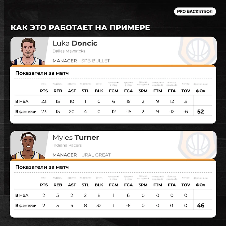 Сайт или приложение в фэнтези сами считают фэнтези-очки игроков в реальном времени. Поэтому следить удобно и легко. Например, забитый трехочковый Луки Дончича приносит менеджеру команды пять фэнтези очков, а блок шот Майлза Тернера — сразу четыре очка.