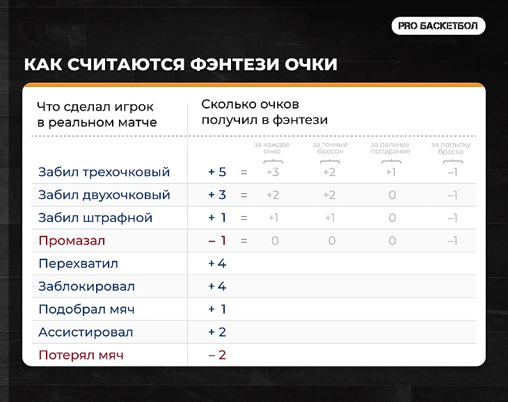 Фэнтези баскетбол основан на статистике игроков в реальных баскетбольных матчах. Менеджеру важно собрать самых эффективных игроков в составе. Ведь кроме того, что результативное действие игрока в реальном матче приносит очки фэнтези команде. Его потери и промахи отнимают эти очки. Поэтому Рассел Уэстбрук со своими трипл-даблами и мусорными бросками не самый лучший вариант для фэнтези.