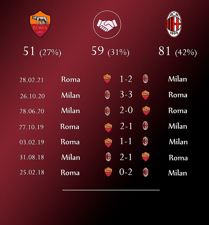 Команды провели 191 встречу, преимущество на стороне Милана