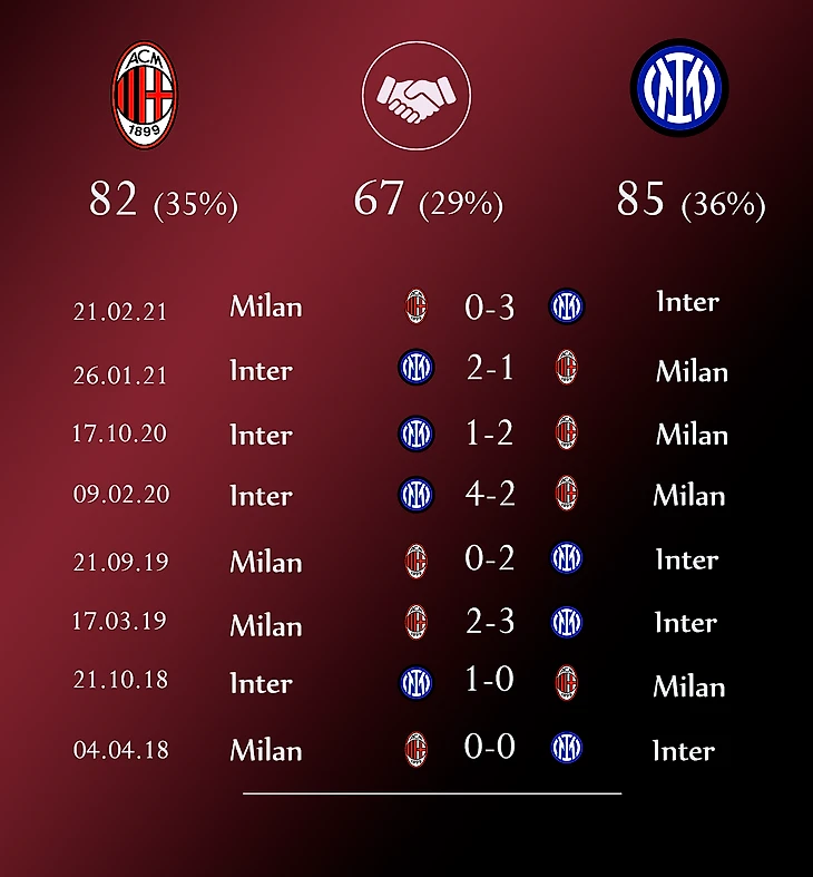 Рассуждать об одном из главным противостояний в мировом футболе можно бесконечно! Соперничество ведет свою летопись с 10 января 1909 года, когда Россонери выиграли со счётом 3:2 у отщепенцев, пожелавших играть в интернациональном составе. Это получилось благодаря мячам Атилио Трере и его партнеров Ланы с Лайхом. В СериАле друзья-враги наиграли 190 матчей, из них Нерадзурри побеждали в 70 противостояниях, 58 дерби завершились вничью, а Россонери отмечали выигрыш в 62 играх. Если брать все турниры, то нам представляется такая картина:
