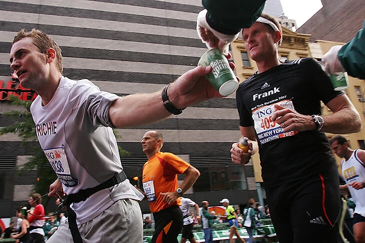 Во время длительного забега организм теряет много жидкости, так что ее обязательно нужно восполнять. На тренировках это не так актуально, но попить после нагрузки точно стоит. Энергетические напитки не нужны – в видах спорта на выносливость они только вредят, так как усиливают расход энергии. Изотоники (спортивные напитки, которые приводят в норму водно-солевой баланс в организме) пить можно, а вот газировку тоже лучше не трогать – газ вызывает метеоризм и вздутие кишечника.
