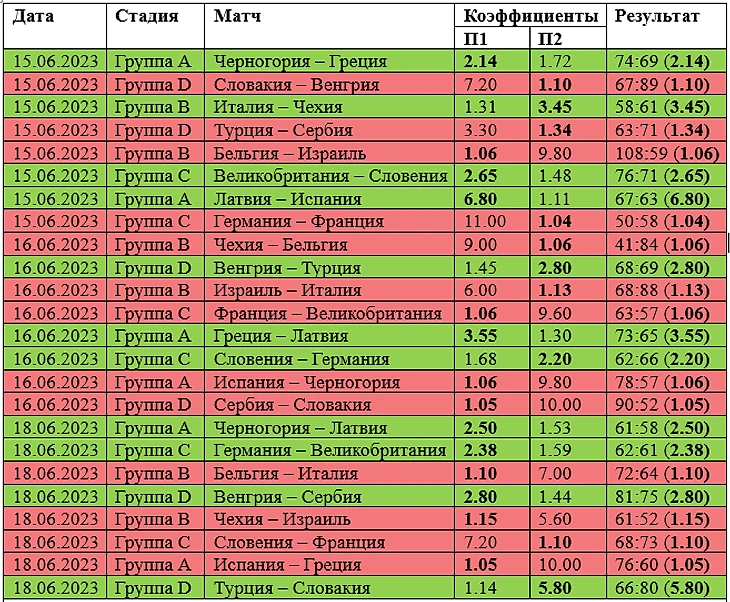 Можно отметить, что самая непредсказуемая команда - это сборная Латвии, которая сначала сенсационно обыграла Испанок (за коэффициент 6.8), а затем дважды неожиданно (по мнению букмекеров) проиграла Греции и Черногории, соответственно (3.55 и 2.5). Самыми предсказуемыми были Бельгия и Франция, которые одержали по 3 победы на групповом этапе и уверенно вышли в следующий этап.