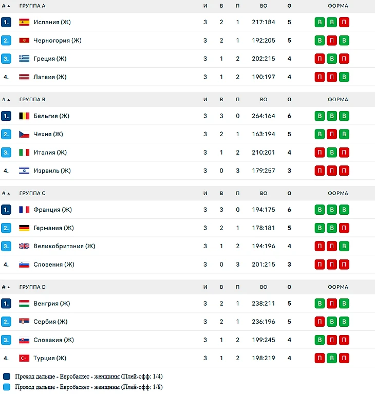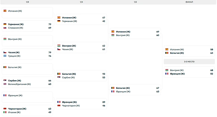 Вот как выглядит итоговая сетка плей-офф ЧЕ по баскетболу среди женских команд: